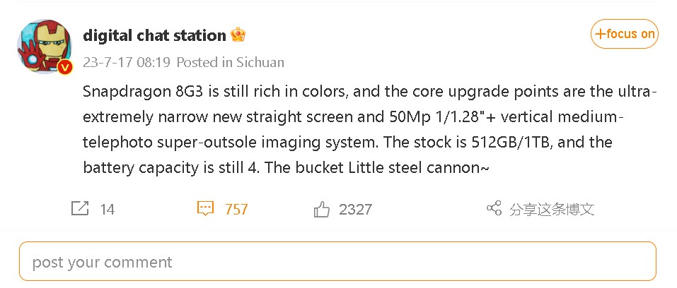 За даними DCS, Xiaomi 14 буде оснащений ще більшим 50-мегапіксельним сенсором основної камери, ніж його попередник. Він матиме 1/1,28-дюймовий сенсор в парі з середньо-телефотографічним блоком. Смартфон також отримає надвузькі рамки на прямому дисплеї. Джерело також додає, що Xiaomi 14 буде пропонуватися в варіантах з 512 ГБ і 1 ТБ пам’яті. Нагадаємо, що поточне покоління Xiaomi 13 має максимальний обсяг пам’яті 512 ГБ.