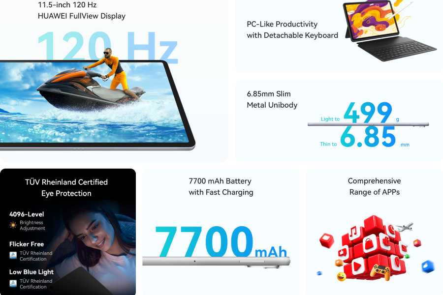Що стосується конструкції, то він має суцільнометалевий корпус товщиною 6,85 мм і вагою 499 грамів. Задня камера має ширококутний об’єктив з роздільною здатністю 13 Мп, а фронтальна камера – 8 Мп. Планшет працює під управлінням операційної системи HarmonyOS 3.1 і оснащений процесором Qualcomm Snapdragon 7 Gen 1. Він має 6 ГБ або 8 ГБ оперативної пам’яті та 128 ГБ вбудованої пам’яті.