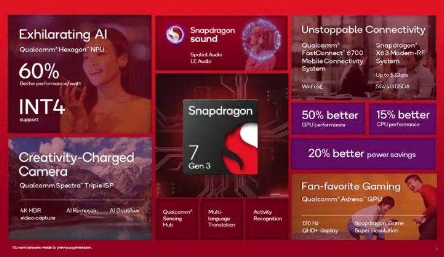 Qualcomm стверджує, що Snapdragon 7 Gen 3 забезпечує майже 15% підвищення продуктивності процесора і більш ніж 50% стрибок продуктивності графічного процесора в порівнянні з попереднім поколінням Snapdragon 7 Gen 1. Чіпсет також забезпечує на 20% кращу економію енергії.